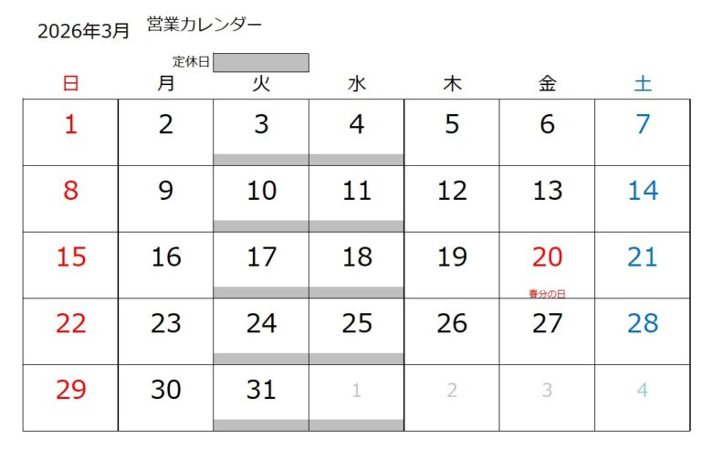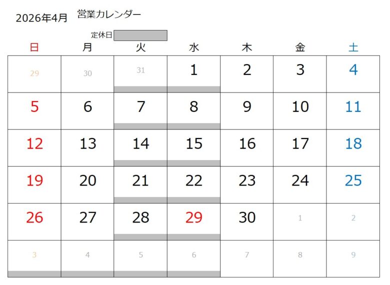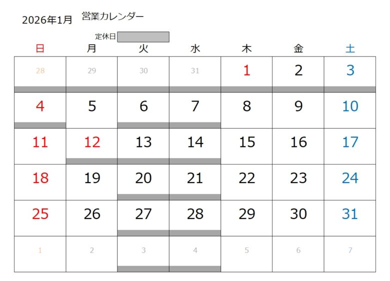 営業カレンダー 2026年1月/10日 新着情報 X (twitter)facebookLINEpocketPinteresthatena 当店は土曜、日曜、営業しております。 お問い合わせお待ちしております。