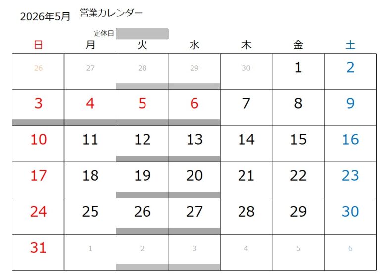 営業カレンダー 2026年4月/1日 新着情報 X (twitter)facebookLINEpocketPinteresthatena 当店は土曜、日曜、営業しております。 お問い合わせお待ちしております。