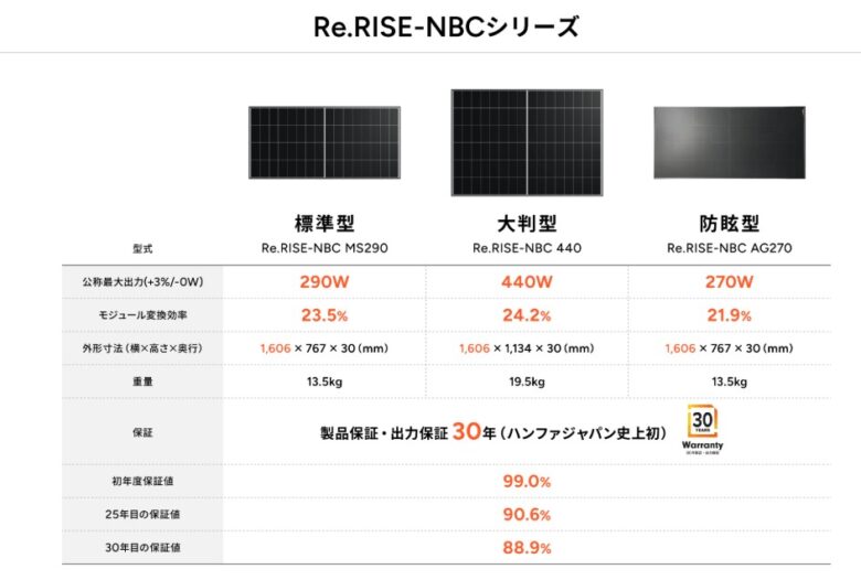 ハンファジャパン、N型バックコンタクト技術搭載の太陽光パネル「Re.RISE-NBC」シリーズを発表 2025年8月/11日 新着情報 X (twitter)facebookLINEpocketPinteresthatena ハンファジャパンは、日本市場限定の太陽光発電ブランド「Re.RISE(リライズ)」の新製品として、最先端のN型バックコンタクト(NBC)技術を搭載した太陽光パネル「Re.RISE-NBC」シリーズを発表しました。 変換効率24.2%、30年長期保証、コンパクト化、防眩パネルの全方位進化で、屋根面の最大効率化を実現 詳しくは下記ハンファジャパンHPをご覧ください。 ハンファジャパン